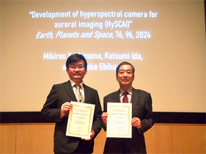 吉沼幹朗助教、居田克巳特任教授、京都大学・生存圏研究所の海老原祐輔教授は、オーロラ観測用ハイパースペクトルカメラ(HySCAI)に関する研究に対して、地球電磁気・地球惑星圏学会(SGEPSS)よりSGEPSS論文賞を受賞しました。